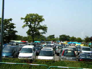 | ご覧の通り、いくつもある駐車場はすべて満車で警備員によって入場制限が行われていた。 「時間をずらしてから来てください」と呼びかけていた。 |