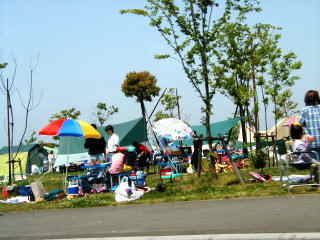 | 芝生上には、なにやらテントのようなものが多数。 ここはキャンプ場か? とにかくすごい混雑でした。GWだからかな。 釣りをすることもできずに、オフ会の集合場所を二度も通りすぎて帰ってきました。 参加者には、不審な動きのカリーナがわかったようです(^^) 今度は、カリーナのオフライン・ミーティングをここで開こうかな〜 |